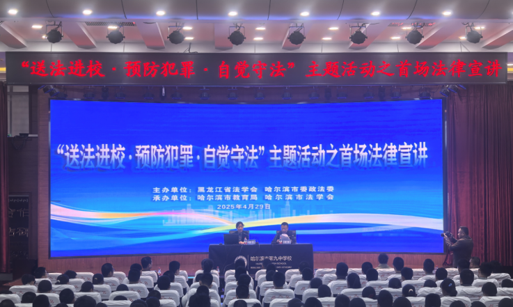 4月29日下午,由黑龙江省法学会、哈尔滨市委政法委主办,哈尔滨市法学会、哈尔滨市教育局承办的“送法进校·预防犯罪·自觉守法”送法进校活动在市第九中学正式启动。伊莉论坛