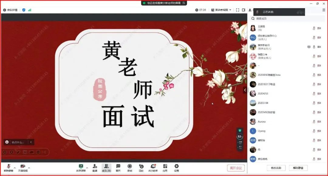 同时,黄老师通过面试真题的实例分析,向学生解析了考题的答题要点和注意事项,让学生们对面试的答题技巧和思路有了更深刻的理解。最后,黄老师进行答疑解惑,并表达了对同学们的殷切期望与美好祝愿。