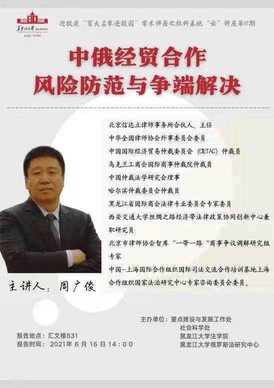 汇文楼835室举行。此次讲座的主讲人是北京信达立律师事务所合伙人、主任周广俊律师,主题为“中俄经贸合作风险防范与争端解决”。讲座由黑大伊莉论坛