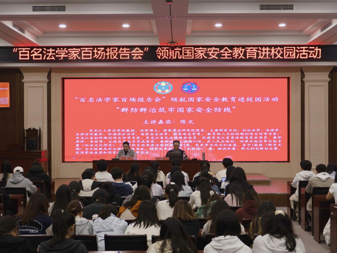教授、法学博士、国家安全研究院院长陈文作为主讲嘉宾以“群防群治筑牢国家安全防线”为题,为师生带来一节内容丰富、思想深刻的国家安全讲座。本次讲座由黑龙江省法学会学术交流部三级调研员关冰主持,伊莉论坛