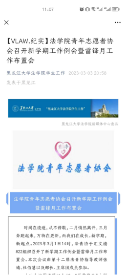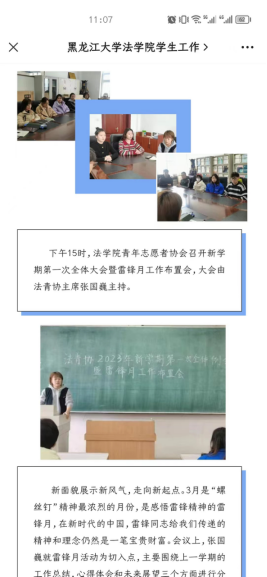 青年志愿者协会召开新学期第一次全体大会暨雷锋月工作布置会,大会由法青协主席张国巍主持。会议上,张国巍主席就雷锋月活动为切入点,主要围绕上一学期的工作总结,心得体会和未来展望三个方面进行分享,并且用简单易懂的例子解释雷锋精神核心,布置了接下来的雷锋月系列活动安排,包括学习雷锋精神、社区志愿服务以及妇女权益保障法、环境保护法、消费者权益保护法等一系列普法实践活动。