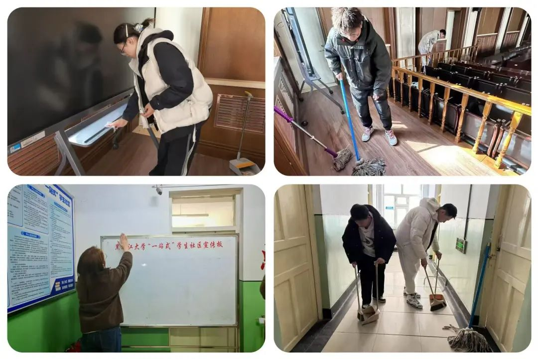 志愿服务过程中,志愿者们分工明确、干劲十足。在C19学生公寓,志愿者们手持扫帚、抹布等清洁工具,认真清扫,不放过任何一个角落的灰尘,做到“清理一处,靓丽一处”,用双手将寝室营造成“美丽社区”;在模拟法庭,志愿者们认真擦拭法台、摆放桌椅、清理地面并对设备进行检查和维护,为后续的模拟法庭课程和竞赛提供了更好的条件。