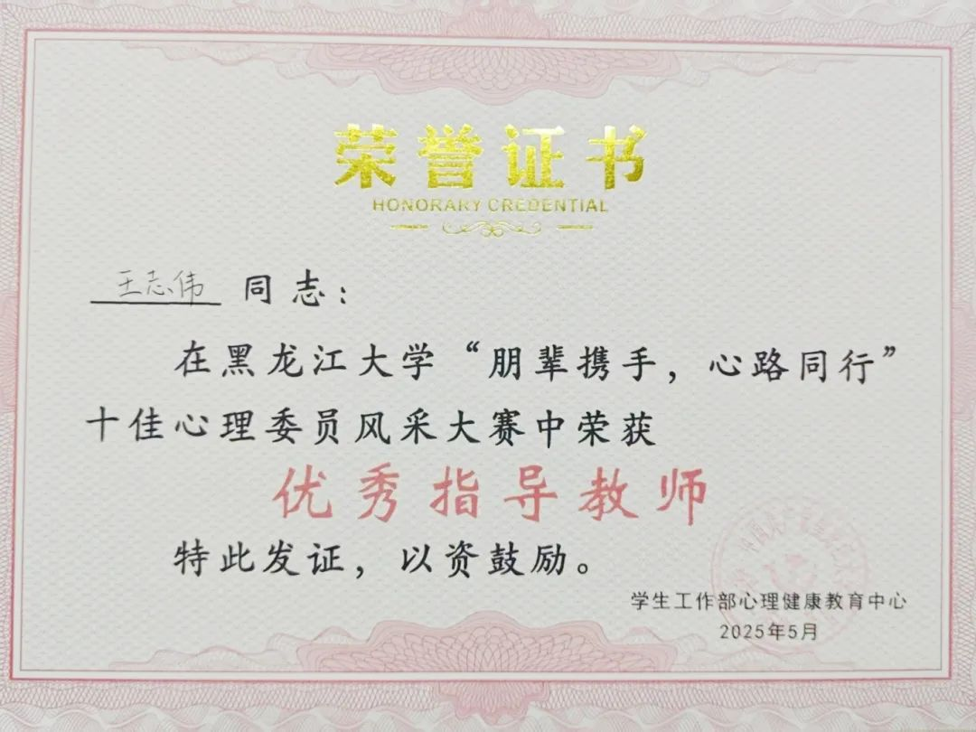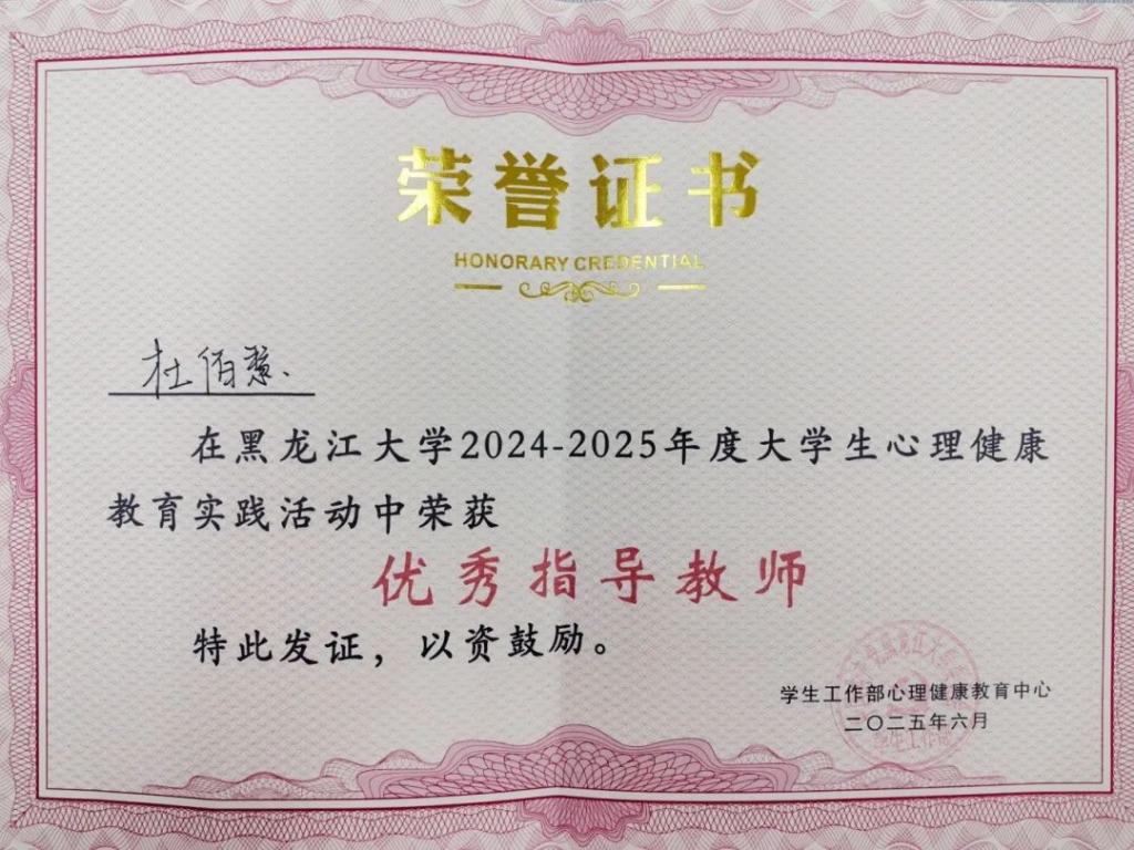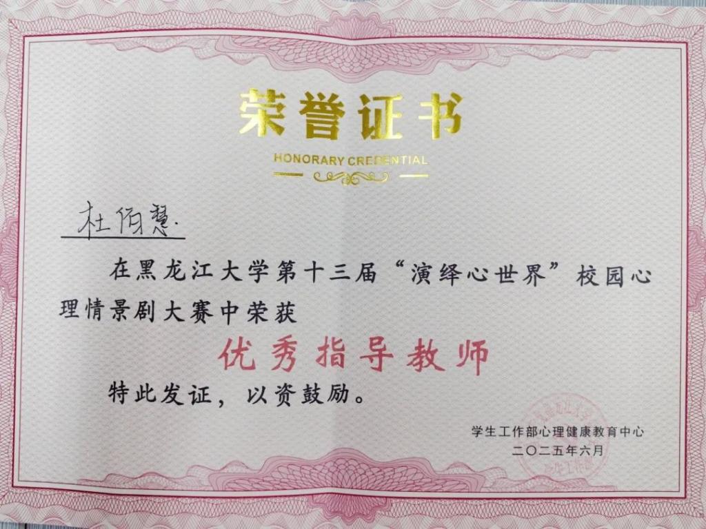 教师指导学生积极参加各类心理健康教育比赛,助力法律与心理的有机结合,为学生心理健康保驾护航,其中杜佰慧老师依托其在活动参与和指导过程中的突出表现,荣获2024-2025学年心理健康教育实践活动“优秀指导教师”、第十三届“演绎心世界”校园心理情景剧大赛“优秀指导教师”荣誉称号,王志伟老师在其卓越的专业能力和对学生的耐心指导的支持下,荣获“朋辈携手,心路同行”十佳心理委员风采大赛“优秀指导教师”荣誉称号。