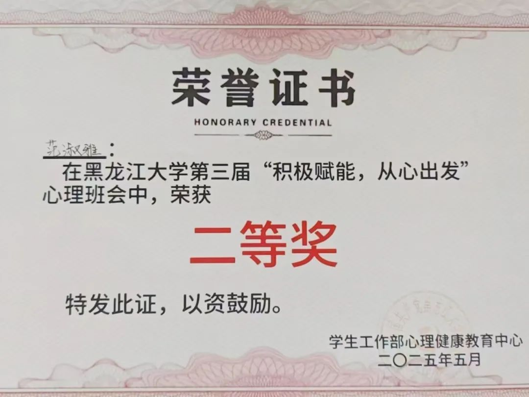2024-2025年度大学生心理健康教育实践活动优秀组织奖,“朋辈携手,心路同行”十佳心理委员风采大赛决赛一、二等奖,第十三届“演绎心世界”校园心理情景剧大赛二等奖,第三届“积极赋能,从心出发”心理班会大赛二等奖,两名教师荣获“优秀指导教师”荣誉称号。