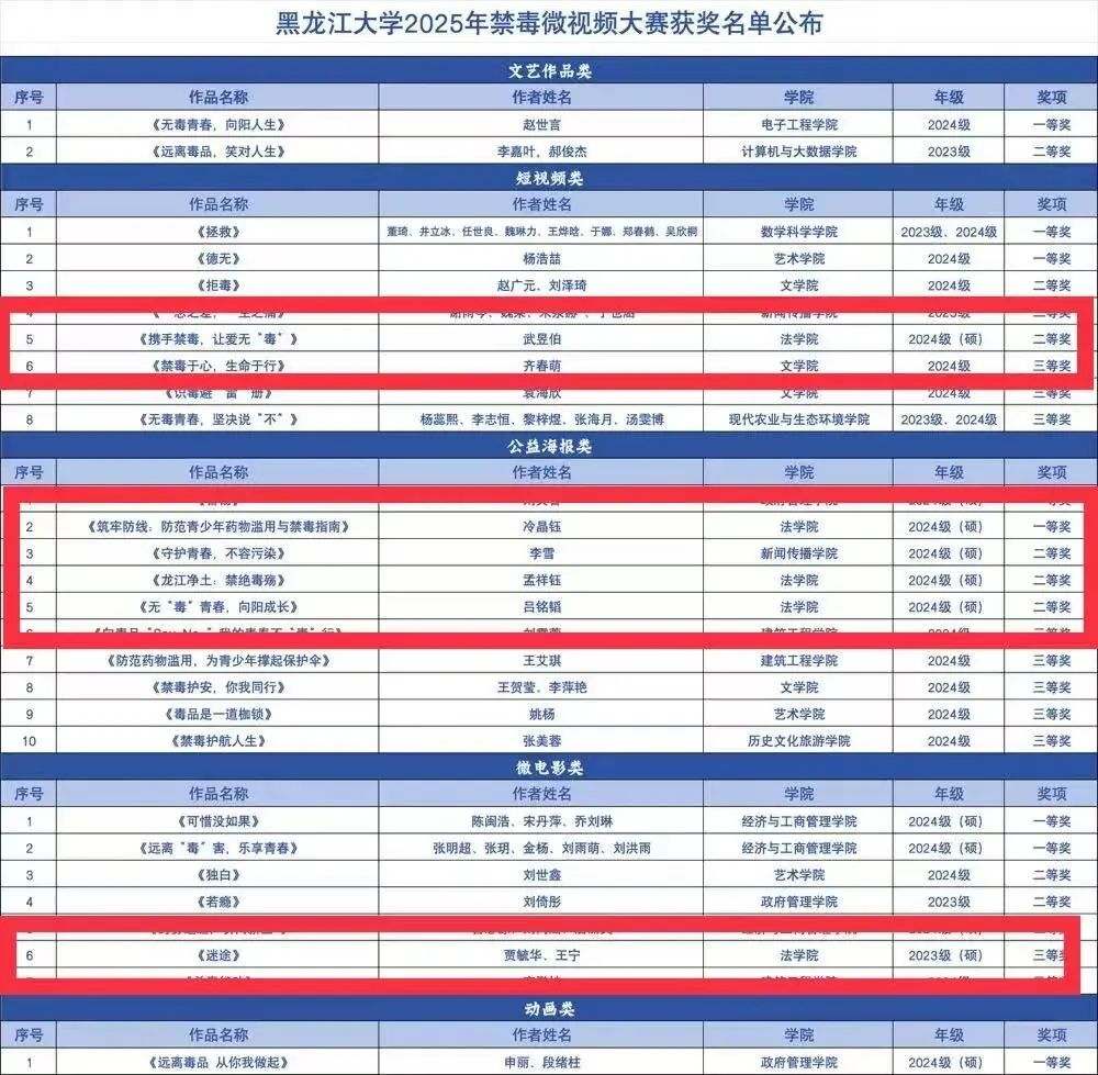2025年6月是第15个全民禁毒宣传月。今年国际禁毒日的主题是“健康人生,绿色无毒”。为切实提高广大师生识毒、防毒、拒毒能力,筑牢校园安全防线,2025年5月-6月,学校举办“无毒青春路·筑梦龙江魂”禁毒微视频创意大赛,比赛由“守护成长”安全教育与危机事件应对辅导员工作室承办。其中伊莉论坛 1名同学获得一等奖,3名同学获得二等奖,1名同学获得三等奖。