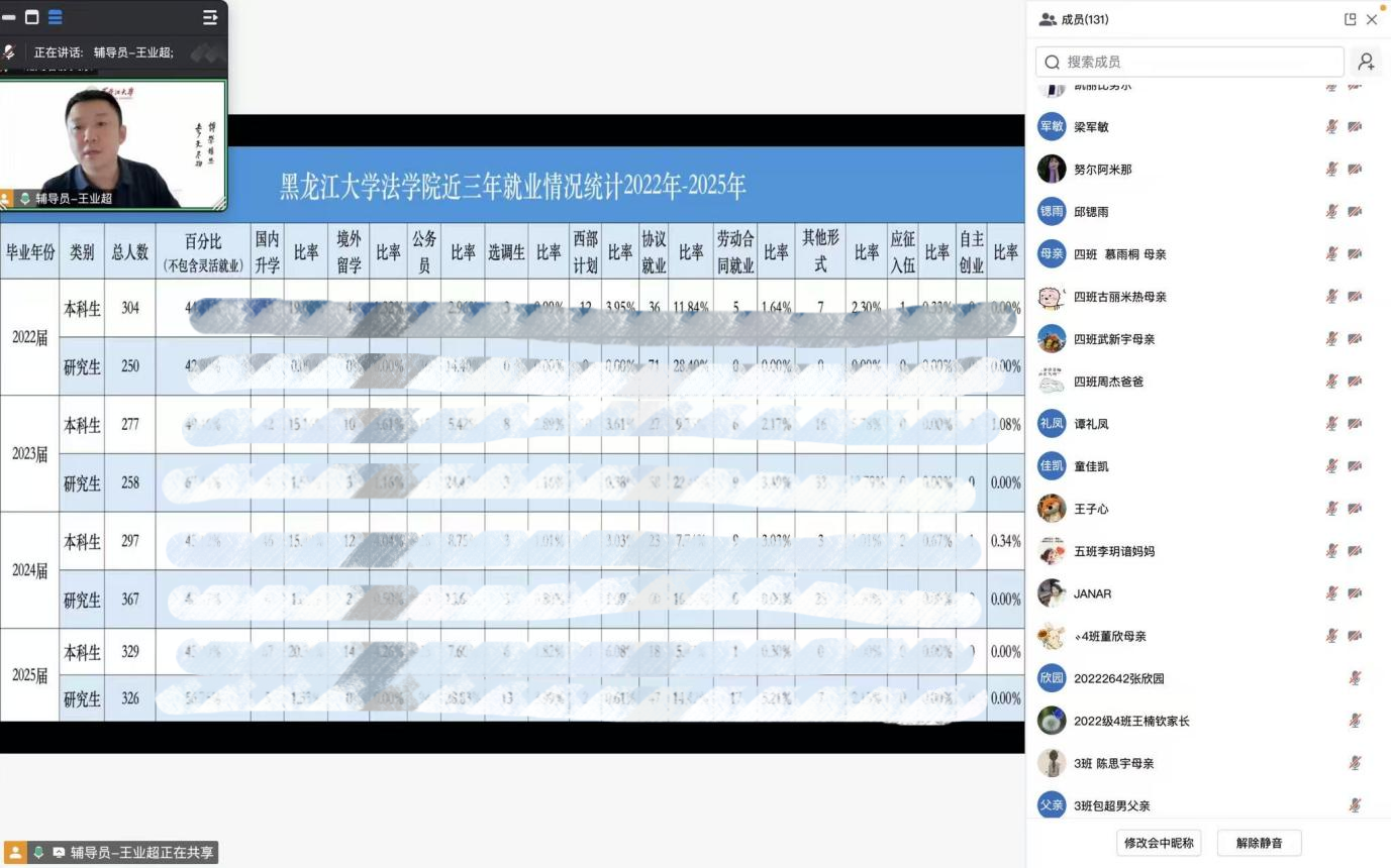 辅导员王业超针对本科学生的特点从2026届就业形势、就业去向的类别、学生如何做好就业规划、家长在就业工作中的作用四个方面进行讲解。他建议家长们了解就业政策,不盲目支持学生的求职选择;多条规划路线,不单一规划未来的职业方向;加强人文关怀,不只是看中求职的结果成绩。同时,王业超老师还分享了学校和学院为本科毕业生提供的就业服务,如简历制作指导、面试技巧培训、校园招聘会组织等,希望家长们协同学院,督促学生积极参与就业准备工作。