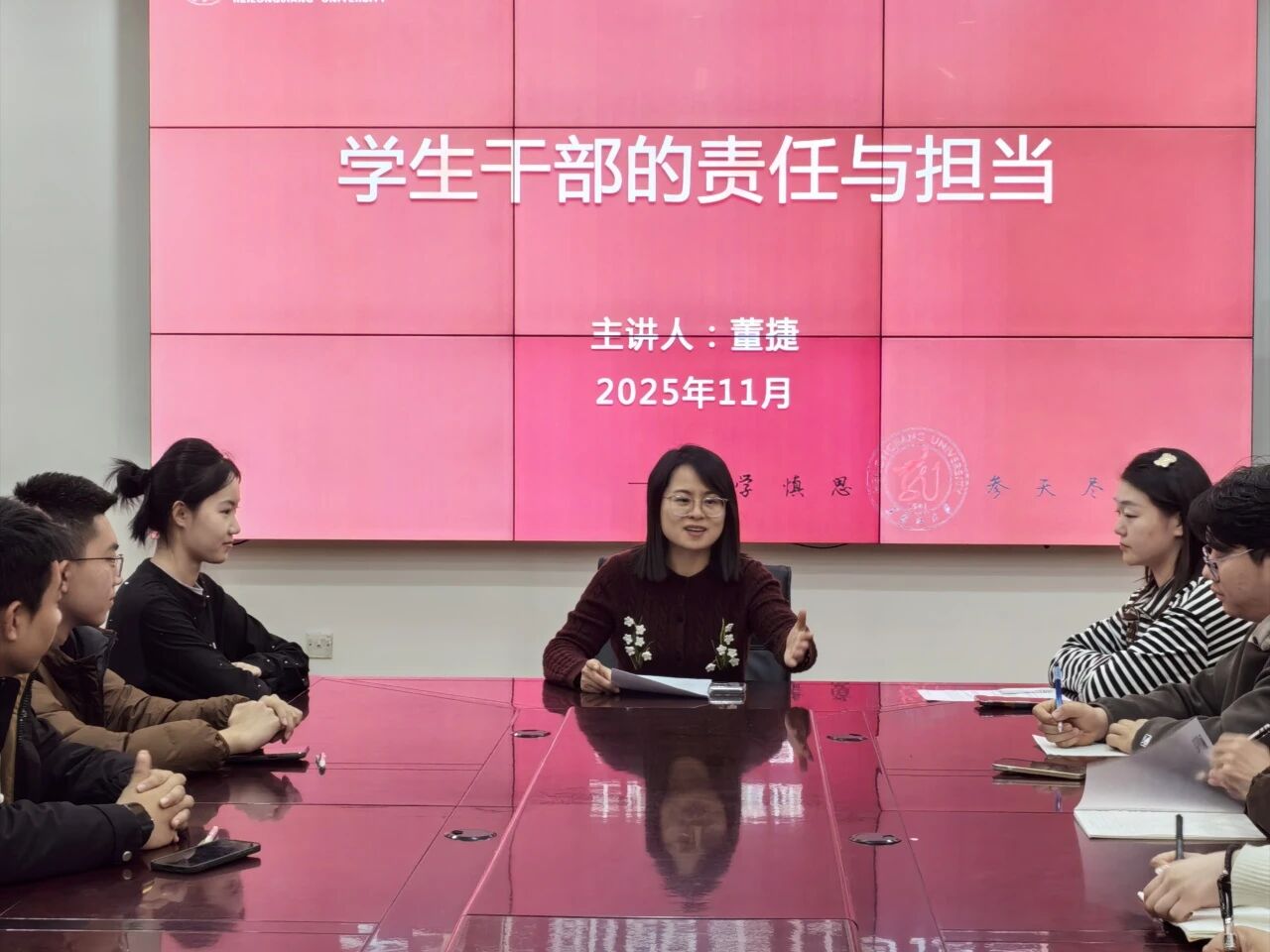 党委副书记董捷以《学生干部的责任与担当》为题进行专题培训,要求全体学生干部明确角色定位,清晰自身“服务者、桥梁者、引领者”的三重角色,以服务同学为核心,做好师生沟通纽带;锤炼本领,提升效能,既要强化政治觉悟和理论素养,也要提升组织协调、沟通表达、解决问题的能力;坚守原则,凝聚合力,恪守公平公正、主动作为、团结协作、反思改进的原则,增强班级凝聚力。