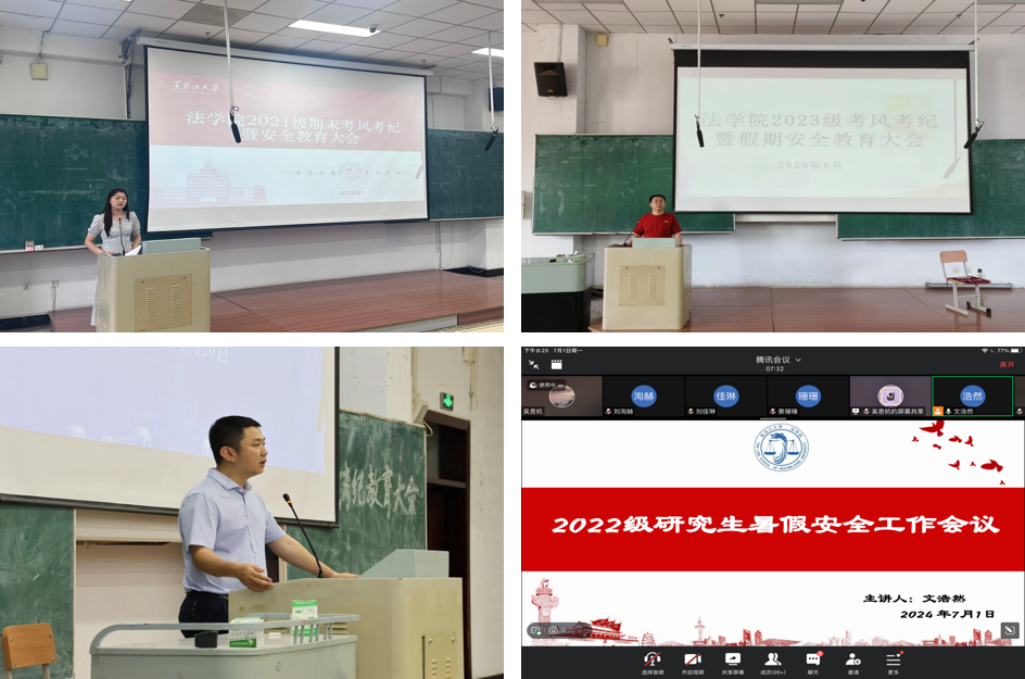 各年级于6月27日-7月5日召开考风考纪暨假期安全教育大会。会议由各年级辅导员主持,本科、研究生全体同学参加会议。