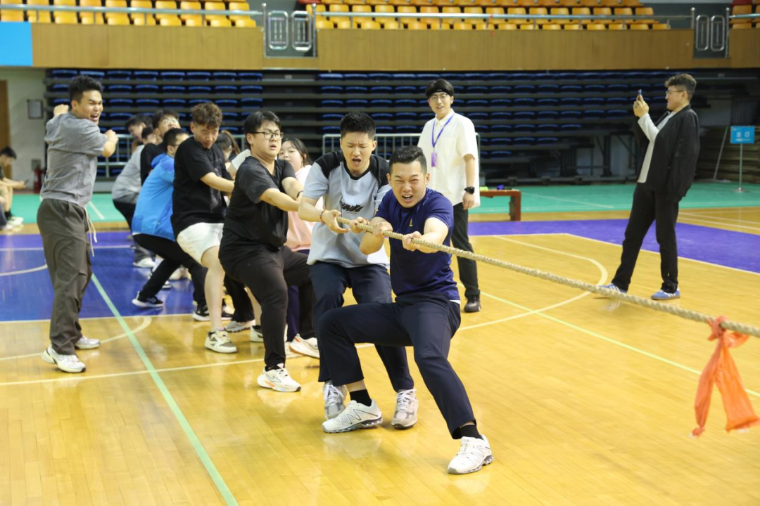 本次趣味运动会特设了师生拔河友谊赛,由学生组的冠军2023级本科生队与教师组进行切磋较量。前两局双方不相上下,赛情焦灼。最后一局,教师组凭借稳定整齐的发力逐渐扩大自己的优势,最终赢下了本场比赛。全场师生一齐为参赛队伍加油呐喊,将比赛推向高潮。