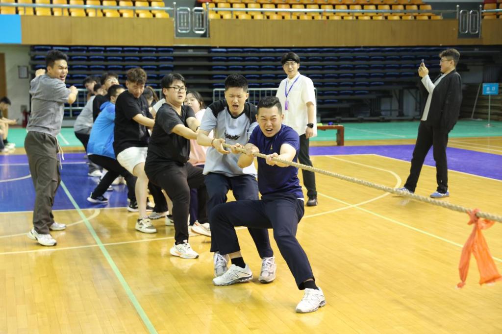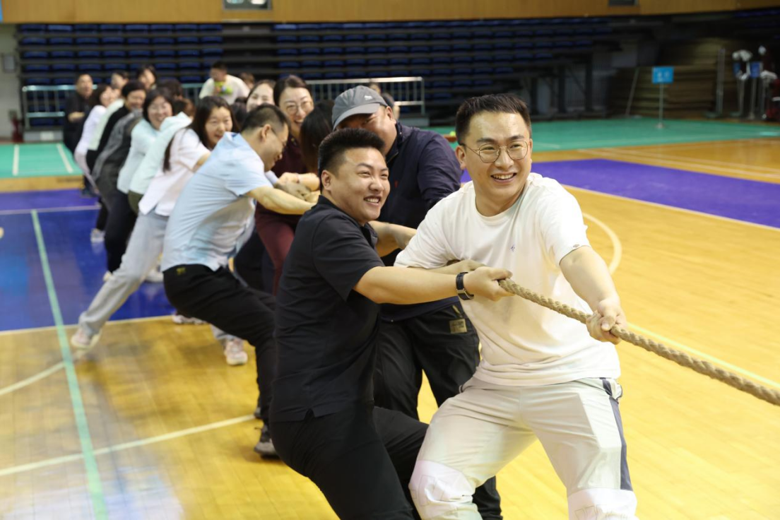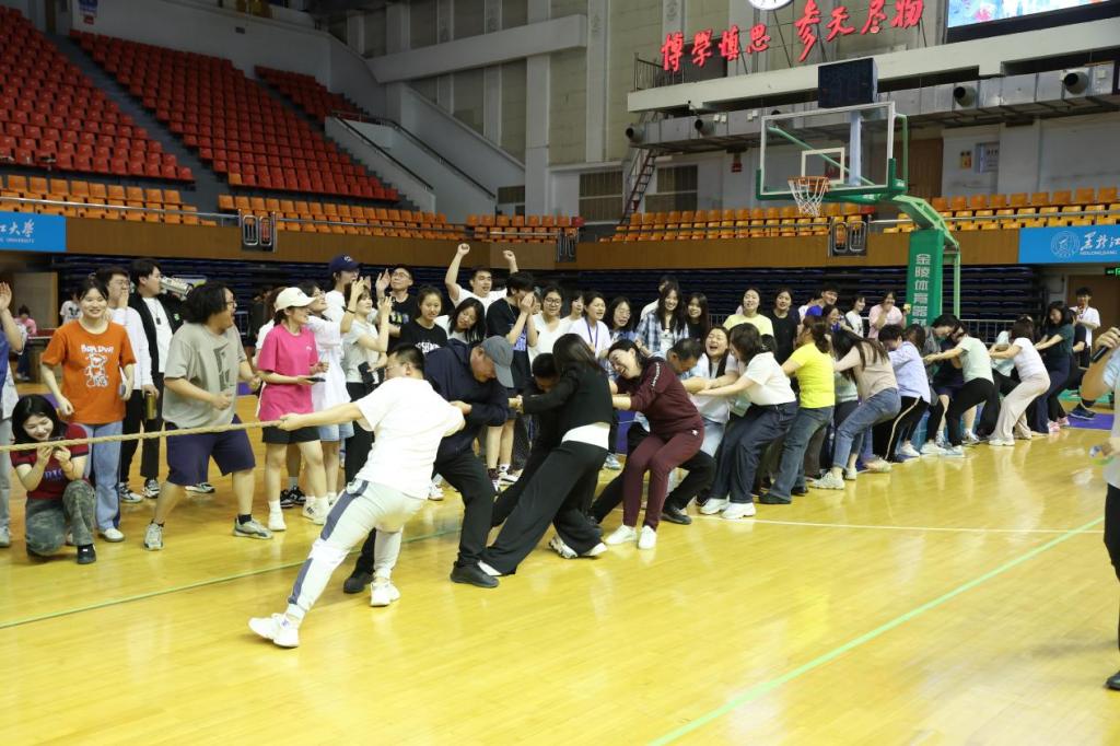本次趣味运动会特设了师生拔河友谊赛,由学生组的冠军2023级本科生队与教师组进行切磋较量。前两局双方不相上下,赛情焦灼。最后一局,教师组凭借稳定整齐的发力逐渐扩大自己的优势,最终赢下了本场比赛。全场师生一齐为参赛队伍加油呐喊,将比赛推向高潮。