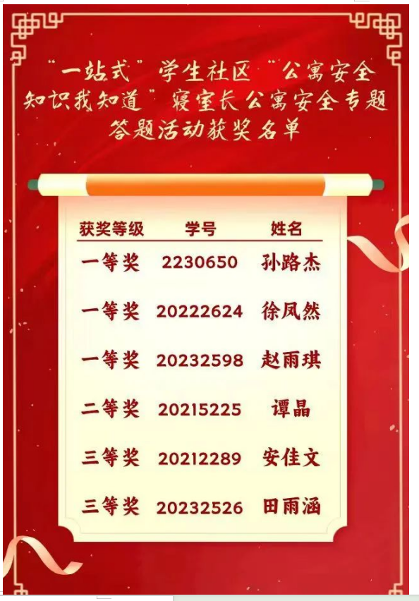 积极响应学工部“一站式〞学生社区“公寓安全知识我知道〞寝室长公寓安全专题答题活动,结合学院工作实际,广泛动员同学们以寝室为单位参与答题活动,全面覆盖2022、2023级本科、研究生共304间寝室,获得一等奖3名,二等奖1名,三等奖2名的好成绩。