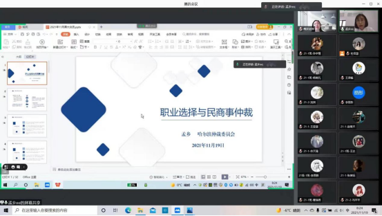 孟乡主要围绕“仲裁的概念与范围”“仲裁的特点与优势”“国内主要仲裁机构构成”““一名合格的仲裁员或仲裁秘书所需具备的条件及其主要工作”等四个方面展开细致的讲解,并对哈尔滨仲裁委员会做详细介绍。讲座过程中,同学们向孟乡提出有关职业选择的疑惑和仲裁工作的问题,孟乡耐心回复,反响热烈。