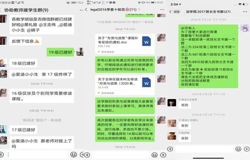 三是督导助学,平稳推进。课程结束以后,学院对教师授课情况及课程内容进行认真审查,做好线上授课质量、监督检查和跟踪评估。通过教学反馈来看,线上课堂出勤率高、学习氛围浓、教学质量好,师生之间教与学双向积极互动,直播中切磋问答,通过QQ群、微信群、腾讯会议、钉钉课堂群等不同平台进行广泛地交流,确保特殊时期防疫、教学两不误。同学们纷纷表示疫情当下,作为法学学子能做的就是要加倍努力学习,做到早日成才,报效祖国。