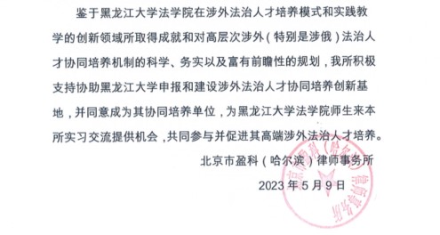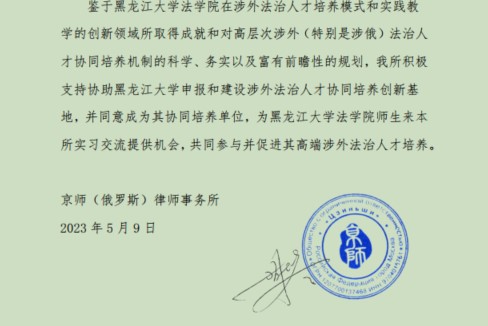 所取得的成就,特别是高层次涉外(涉俄)法治人才协同培养机制方面的科学、务实及富有前瞻性的规划,获得了京师律师事务所俄罗斯分所、北京市盈科(哈尔滨)律师事务所在内的多家实践单位的协同培养意向,并共同拟定方案后积极参与到高端涉外涉俄法治人才培养之中。