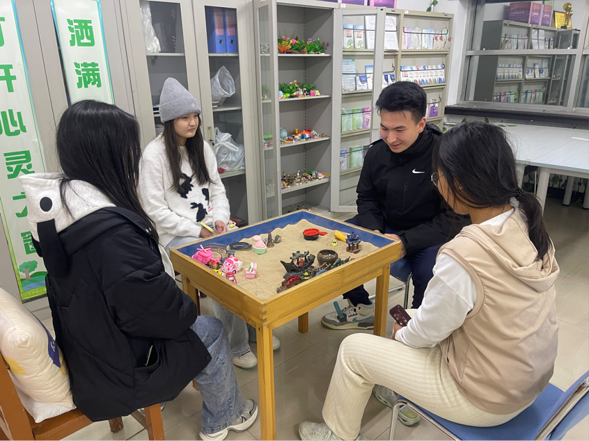 活动伊始,主持人详细介绍了“减法”沙盘活动的目的和意义,使同学们对沙盘活动有了初步的了解。在主持人的引导下同学们开始进行沙盘创作,他们用心挑选着各种沙具,小心翼翼地摆放在沙盘上,仿佛在构建一个属于自己的内心世界。每一个沙具的选择,每一次摆放的位置,都蕴含着同学们内心深处的情感与思考。在这个快节奏的社会中,人们往往承受着来自各个方面的压力,而“减法”沙盘正是通过让参与者在沙盘中进行选择和舍弃,帮助他们学会放下负担,轻装上阵,在纷繁复杂的世界中保持内心的平静,以更加积极健康的心态面对生活。