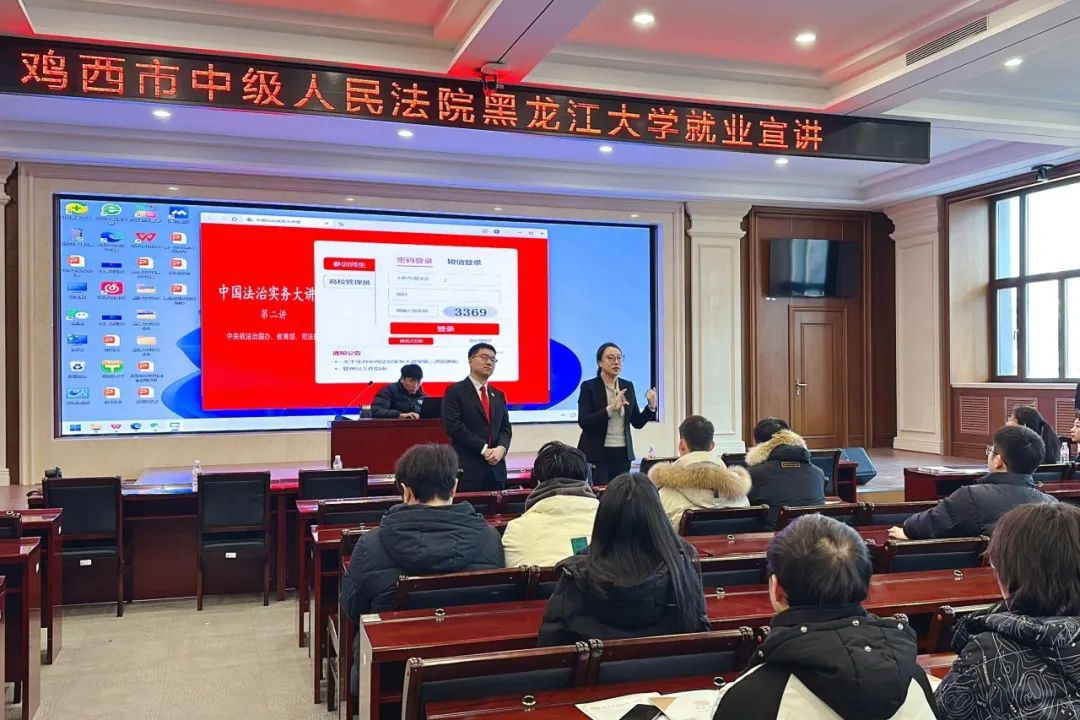 宣讲会上,鸡西市中级人民法院工作人员曹旭详细介绍了法院的历史沿革、人员结构、工作环境以及报考理由等多个方面,全面展示了鸡西法院的独特魅力和广阔发展前景。同时,强调了鸡西法院注重年轻干部的培养,建立了“百名优秀人才库”和“年轻干部储备库”,为职业发展提供了广阔的空间和平台。最后,曹旭诚挚地邀请广大有志青年加入鸡西法院,共同为法治事业添砖加瓦。