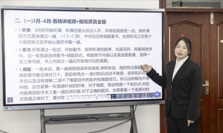 宋叶婷同学从客观题备考的时间线切入,将整个备考阶段划分为前期准备、学习规划和心态调整三个部分。针对重要复习科目,详细介绍、推荐了优质的网课老师,并鼓励同学们勇于尝试,找到适合自己的学习路径。