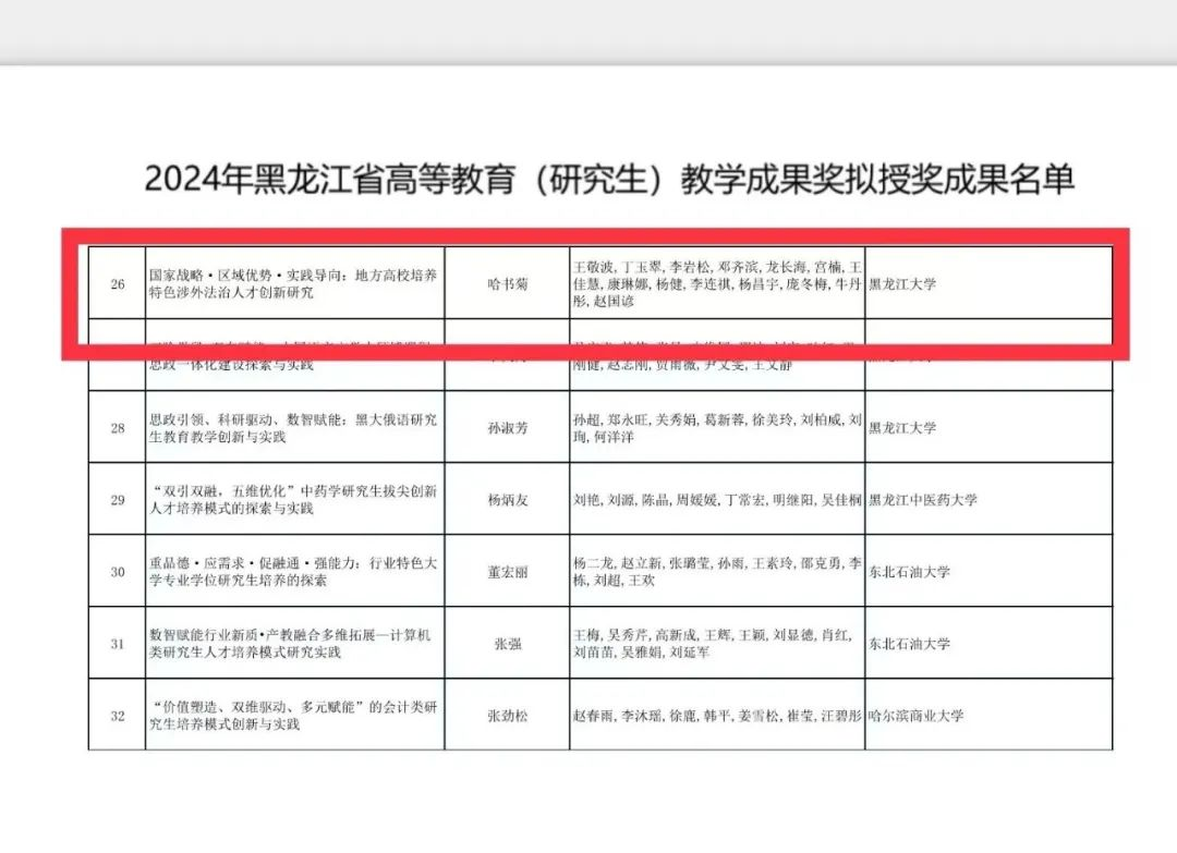 按照《关于开展2024年黑龙江省高等教育(本科、研究生)和职业教育教学成果奖评审工作的通知》,经个人和单位申报、专家评审、教学成果奖评审委员会审议,黑龙江省教育厅对2024年黑龙江省高等教育(研究生)教学成果奖拟授奖成果名单进行公示。伊莉论坛 荣获2024年黑龙江省高等教育(研究生)教学成果奖一等奖。