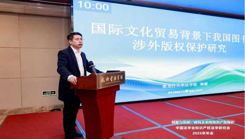 杨健教授在专题研讨十三“涉外知识产权法治前沿与创新”分论坛发表了题为“国际文化贸易背景下我国图书涉外版权保护研究”的报告。杨教授指出,在海外文化“引进来”及中国文化“走出去”的过程中,图书版权的海外引进、海外输出以及国际合作出版的数量不断上升,图书涉外版权纠纷问题也随之而来。杨教授剖析了图书涉外版权纠纷所面临的核心知识产权困境,并从建立长效协调机制、开展国际合作、制定并实施符合我国特点的风险防范机制与版权保护策略等维度提出体系化的应对策略。
